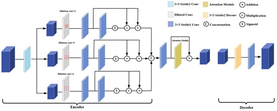 We propose the attention-aware feature extraction module. This module exhibits resemblances to a 2D U-Net, featuring elementary units that encompass both an encoder and a decoder, complete with skip connections. The encoder forms a network composed of dilated convolutional layers and an attention module, as depicted in Figure 2. In the encoder section, the features are initially subsampled using a convolutional layer with a stride of 2. Subsequently, dilated convolutional layers with 3 × 3 kernel are employed to expand the receptive field of the input features. To address potential information correlation issues associated with the use of dilated convolution, we adopt a strategy similar to that of [], where feature maps are passed through a residual network structure with Sigmoid function after undergoing dilated convolutional layer with different dilation rate. To create the final feature map, the three fine-grained features are combined and run through a convolutional layer with an attention module. A convolutional layer and deconvolutional layer with 3 × 3 kernel make up the decoder. When provided with a reference image and source images at a resolution of captured from different viewpoints, the attention-aware feature extraction module outputs three different scales of features, denoted as , where represents the -th stage.