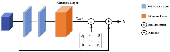 In this equation, and represent the queries, keys, and values, respectively, with the matrices composed of learnable parameters. Here, denotes a local region with a 3 × 3 input size. To address the issue of permutation equivariance resulting from the lack of encoded positional information, we introduce relative positional embeddings by incorporating learnable parameters into the keys, as described in []. The relative distance vector is partitioned along the dimensions, with half of the dimension of the output channel allocated for encoding the row direction and the remaining half for encoding the column direction. Furthermore, the features , produced by the attention layer, need to be multiplied by the learned diagonal matrix weights within the network.