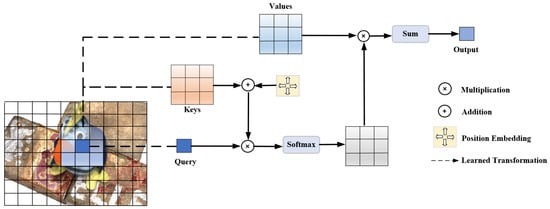 Figure 3 provides a visual representation of the attention module’s architectural design. The features, which have undergone triple dilated convolution, are input into two convolutional layers with 3 × 3 kernel. Each of these layers goes through Group Normalization (GN) and a ReLU activation function. Subsequently, we incorporate a LayerScale-based local attention layer []. The operational details of this local attention layer are elucidated in Figure 4, illustrating the mapping of queries and a collection of key-value pairs to generate an output, with pixel outputs computed via Softmax operation.