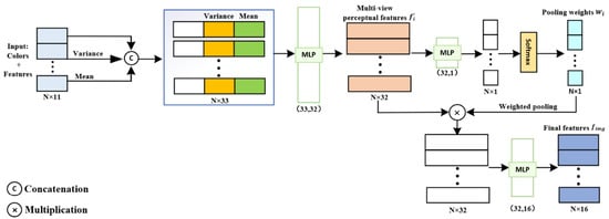 We utilize a weighted pooling operator, denoted as , to aggregate the multi-view feature vectors, as illustrated in Figure 5. Initially, we combine the feature vector with the pixel information to create a two-dimensional feature vector. Subsequently, we compute the mean and variance of the two-dimensional feature vector to capture both local and global information. Then, the two-dimensional feature vector is concatenated with and fed into our specially designed lightweight MLP, extracting the multi-view perceptual features, denoted as , and the pooling weights, denoted as . Finally, by applying a Softmax operation to the weight vector, we perform a weighted pooling operation on the multi-view perceptual features, resulting in the final feature vector :
