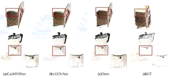 Our model was assessed with 5 neighboring views () and input images at a resolution of 1152 × 864 pixels. We conducted a comparative analysis between our outcomes and those obtained from various traditional techniques as well as cutting-edge learning-based approaches. The quantitative evaluation results are presented in Table 1. Our method excelled in terms of completeness, exhibiting a significant 27% improvement compared to CVP-MVSNet []. Moreover, our approach outperformed existing advanced methods in terms of overall reconstruction quality. In addition to quantitative analysis, Figure 7 provides visual qualitative results of the reconstructed point clouds. Our model generated more complete point clouds with finer texture details in challenging regions characterized by weak textures and lighting reflections compared to CasMVSNet [] and UCS-Net [].