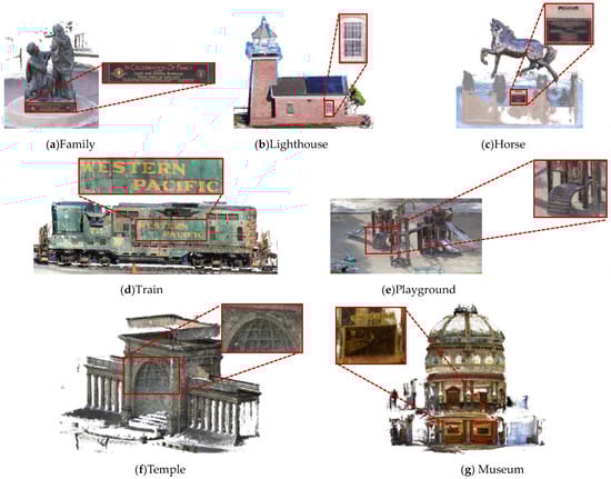 Visualization of 3D point clouds of (a) the scene “Family”, (b) the scene “Lighthouse”, (c) the scene “Horse”, (d) the scene “Train”, (e) the scene “Playground”, (f) the scene “Temple”, and (g) the scene “Museum” on the intermediate and advanced subsets of the Tanks and Temples dataset.