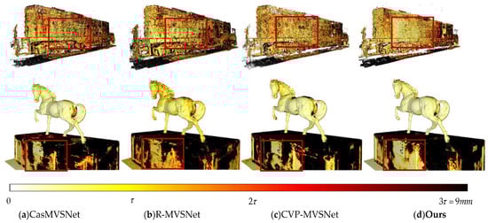 The precision results of the “Train” () and the recall results of the “Horse” () scenes reconstructed on the Tanks and Temples dataset are compared with the CasMVSNet, R-MVSNet, and CVP-MVSNet. Here, represents the official distance threshold, and darker regions indicate higher errors relative to .