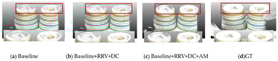 We have discussed the impact of the attention-aware feature extraction module and different loss functions on the final reconstruction of point clouds and the associated effects on model parameters, inference time, and memory usage during testing, building upon the baseline model CasMVSNet. The outcomes are displayed in Table 4, clearly illustrating that the attention-aware feature extraction module along with the two loss functions significantly enhances the integrity of the point cloud reconstruction. When these components are combined with the baseline CasMVSNet model, the improvement in point cloud reconstruction is most prominent in terms of integrity assessment, while maintaining a high overall evaluation level. Our proposed model, during the evaluation process on the test dataset, bypasses the neural volume rendering network. Instead, it utilizes the MVS network to estimate depth maps based on the learned feature weights. As a result, a minor increase in the number of parameters, inference time, and memory usage over the baseline model is introduced to enhance the completeness and overall quality of the reconstructed point clouds. We also visualize the influence of these components on the reconstruction results, as shown in Figure 10. By adding the neural volume rendering network and incorporating rendering reference view loss and depth consistency loss to the baseline CasMVSNet, the neural volume rendering network learns additional scene geometry information beyond the cost volume representing scene geometry. This leads to an enhancement in the completeness of the reconstructed point cloud. Additionally, the inclusion of the attention-aware feature extraction module extracts rich feature information to mitigate feature-matching errors, resulting in improved reconstruction results for point clouds in regions with weak texture and non-Lambertian surfaces.