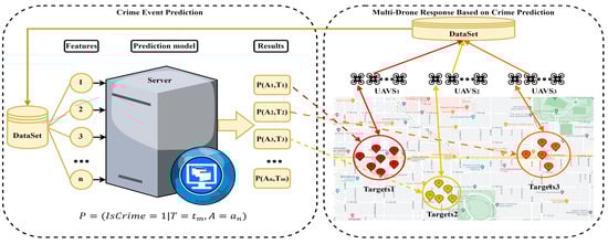 In this study, Figure 1 presents the proposed system structure, which consists of two parts: crime event prediction and the collective intelligence response. It includes a central database, a server, and drones equipped with various sensors (UAVS). The central database stores various feature data and prediction results. The server is the central processing entity in the system, responsible for data preprocessing, model computation, crime prediction, and the allocation of drones to patrolled areas. First, data are inputted into the model on the left, and the predicted output P is set to be the high-crime area in region at time period , corresponding to in the circle on the right. Next, UAVS are clustered into , where i = j, with each UAV patrolling its corresponding targets. Finally, drones can collect data through sensors during patrolling and feed them back to the dataset before repeating the above process.