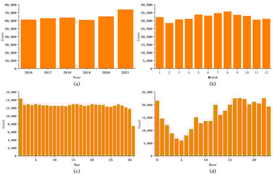 Temporal correlation analysis. (a) The trend of crime numbers over the years; (b) The trend of crime numbers over the months; (c) The trend of crime numbers over the days; (d) The trend of crime numbers over the hours.