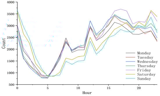 As is depicted in Figure 2d and Figure 3, there are significant variations in the number of crime events during different time intervals throughout the day. On workdays, the occurrences of crime events peak between 12:00 and 18:00, with a smaller peak observed between 12:00 and 13:00. On weekends, the distribution trend of crime events is similar to that of the workdays. Before 5:00 AM, the total number of crime events on weekends tends to surpass that of the workdays.