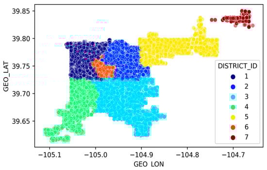 In this section, we delve into the correlation between crime events and spatial factors. By means of a statistical analysis, the spatial distribution patterns of crime events can be derived, as is depicted in Figure 4. The entire city is partitioned into seven police districts, with each color representing the distribution of crime events in a specific district. A distinct difference in district sizes is evident, as seen from the Figure. Specifically speaking, District 3 has the largest area, followed by Districts 4 and 5, while District 6 encompasses the smallest area. This implies that District 3 covers a relatively larger area, and likely encompasses the most densely populated regions and various social activity hubs, which may result in a higher concentration of crime events. In contrast, District 7’s smaller area might indicate a more secluded region or a relatively sparser community population, potentially leading to fewer crime events and a comparatively safer environment.