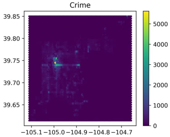 In this section, an analysis of the number of crime events, which occurred during different time periods in Denver, is conducted, with different time intervals exhibiting distinct patterns in the distribution of crime events. As is shown in Figure 2a, there is a fluctuation in the number of crime events between 2020 and 2021, displaying an upward trend. This suggests that public security in Denver still requires improvement. Figure 2b illustrates the monthly distribution of crime events. The results reveal that August has the highest occurrence rate of crime events, followed by July and January, while February witnesses the lowest number of incidents. Figure 2c delves into the impact of dates within each month on the number of crime events. Notably, there is a dip in occurrences on the 31st day, as not all months have 31 days. On the contrary, a peak is observed on the 1st day, possibly attributed to New Year’s Day and its higher population density, which may lead to an abnormal increase in crime incidents.