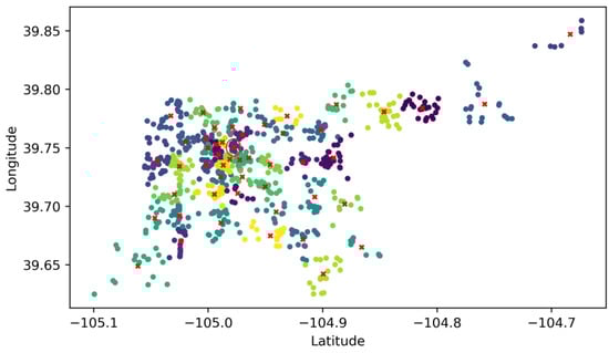 - Ester, M.; Kriegel, H.P.; Sander, J.; Xu, X. A density-based algorithm for discovering clusters in large spatial databases with noise. In KDD’96, Proceedings of the Second International Conference on Knowledge Discovery and Data Mining, Portland, OR, USA, 2–4 August 1996; AAAI Press: Washington, DC, USA, 1996; Volume 96, pp. 226–231. [Google Scholar]