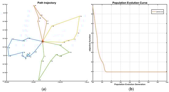 As is shown in Figure 16a, the cruise trajectories from the experimental simulation are illustrated. The four distinct colors correspond to the four individual drones, and their trajectories neither overlap nor revisit the target points. This approach ensures an efficient enhancement of response efficiency. Furthermore, Figure 16b depicts the population evolution curve. The objective function gradually converges to its optimal value as the iteration count increases. By the time it reaches 400 iterations, it demonstrates a near-complete convergence.