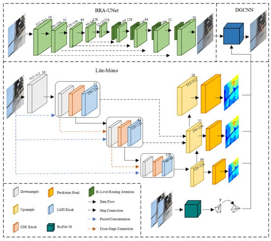 The framework diagram of the UD-Net. The BRA-UNet is used for preliminary feature extraction, and then combined with the Lite Mono algorithm and DGCNN to refine the recognition results.