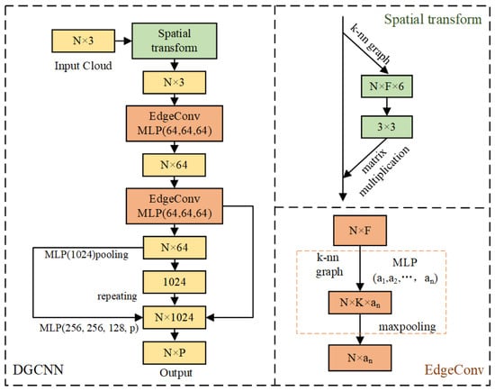 DGCNN architecture. The right-side diagrams represent the spatial transform and EdgeConv, respectively. The spatial transform module utilizes the estimated 3 × 3 matrix to map the input to the canonical space.