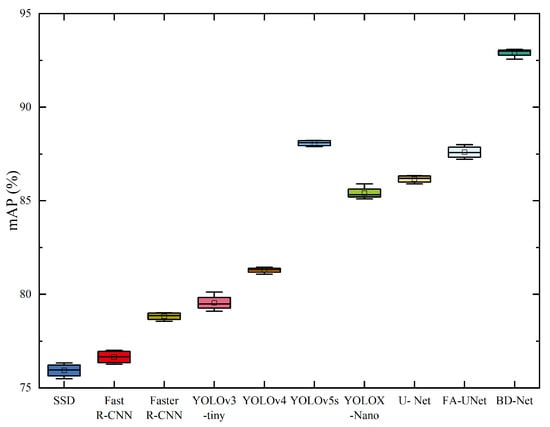 Figure 4 offers an intuitive representation of the comparison results of various algorithms via a box plot. As the figure shows, YOLOv5s exhibits commendable detection performance among the YOLO (you only look once) series algorithms. However, a noticeable performance disparity exists when juxtaposed with the UD-Net algorithm. The UD-Net model showcases reduced variance across multiple experimental runs, highlighting its consistent and superior performance.