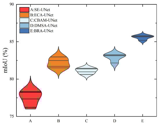 Violin plots of detection results for U-Net networks embedded with different attention mechanisms.