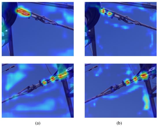 To validate the superiority of embedding the BRA attention module into the UNet network, experiments were conducted by upsampling on the U-Net network, incorporating various attention mechanisms including squeeze-and-excitation networks (SENet) [46], dual multiscale attention network (DMSANet) [47], efficient channel attention networks (ECANet) [48], convolutional block attention module (CBAM) [49], and the BRA attention mechanism. We carried out the experiments four times on the shackle dataset and the results are presented in Figure 5. It is evident that the integration of the BRA mechanism into the network enhances detection accuracy and ensures its stability. The inclusion of the BRA attention mechanism effectively expands receptive fields and contextual information, thereby substantially enhancing the performance of the U-Net model. As the heatmaps shown in Figure 6 demonstrate, the regions of interest for the target classifier become more pronounced, and the high-response zones in the heatmap are focused on target fittings. These results indicate that the enhanced BRA-UNet effectively focuses on the fittings target. Furthermore, incorporating the BRA attention mechanism lessens the model’s reliance on external data and bolsters its ability to discern internal data correlations.