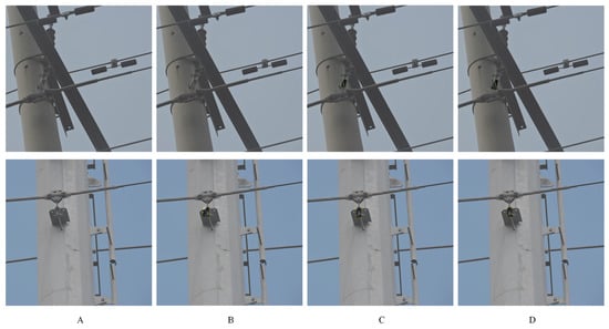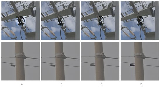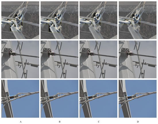 As depicted in Figure 8, while methods A and B fail to detect the ball eyes among the small targets, methods C and D successfully identify them. For the shackle, method A experiences missed detection issues. With methods B and C, even though the targets are detected, there are inaccuracies in the positioning and dimensions of the target boxes. Relative to the first three methods, method D not only rectifies the missed detection cases in small target fittings but also exhibits superior recognition capabilities. For the thimble that is partially obscured by steel strands, as seen in Figure 9, the detection results in the first row clearly show that method D adeptly identifies thimble images with occlusion challenges. In a similar vein, the image of the damper obscured by the cement pole is uniquely discerned by our proposed method D.