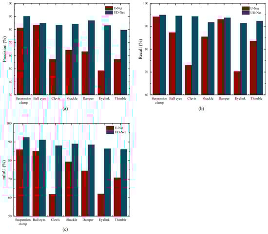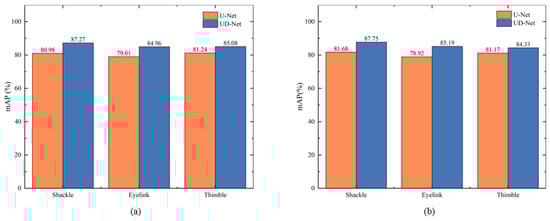 Figure 10 provides a more intuitive representation of the results through bar charts. From the comprehensive results depicted in these three bar charts, the enhanced UD-Net model demonstrates superior detection performance with higher values for mIoU, Precision, and Recall compared to the U-Net model. As can be observed from Figure 10a,b, the UD-Net detection algorithm demonstrates significant enhancements in both Precision and Recall. This improvement is particularly evident for the images of a clevis and an eyelink, suggesting that the algorithm is better equipped to identify targets within fittings images while significantly reducing the rate of missed detections. Figure 10c reveal that the UD-Net detection algorithm excels in the task of accurately detecting fittings images, while also minimizing the likelihood of misidentifying intricate backgrounds as fittings targets.