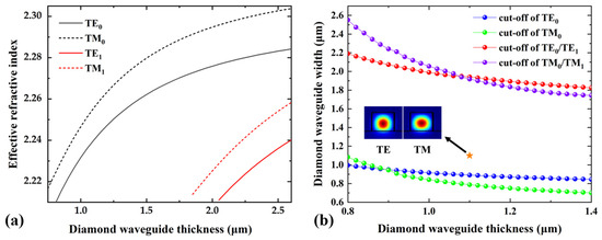 (a) Correlation between the effective refractive index (TE and TM modes) and the width at λ = 1.55 µm. (b) Variation in the cut-off dimension as a function of diamond waveguide thickness and width at λ = 1.55 µm. Inset: mode profile of the fundamental TE and TM modes.