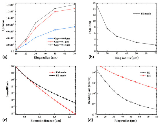 where L denotes the resonator length; r1 and r2 represent the loss coefficients, where r1 = r2; and a = exp(−αL⁄2), where α signifies the total loss in the ring, encompassing material absorption, radiation loss, and scattering loss due to wall roughness. Figure 4a showcases the correlation between the Q-factor and bending radius of the TE mode microring resonator (excluding the racetrack structure) for various gap sizes. For microring radii below 50 μm, the Q-factor exhibits a rapid increase as the radius grows. However, this increase in the Q-factor becomes less pronounced as the radius exceeds 50 μm. This behavior can be attributed to the reduction in radiation losses with larger curvature radii. Concurrently, as the microring length increases, the total propagation losses stabilize, leading to a more gradual increase in the Q-factor. The FSR, defined as the distance between neighboring resonant wavelengths, can be expressed as follows [36]: