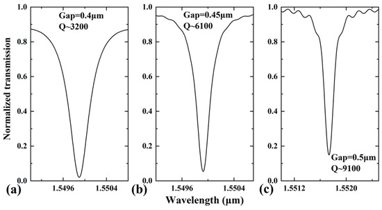 Normalized transmission spectra of the TE mode in racetrack microring resonator with gap sizes of (a) 0.4 μm, (b) 0.45 μm and (c) 0.5 μm.