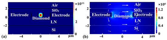 (a) Distribution of light field intensity in diamond waveguide at λ = 1.55 μm. (b) Distribution of electric field intensity when 1 V voltage is applied to the electrode.