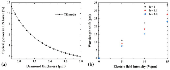 Figure 7a depicts the optical power percentage of the TE mode in the LN layer for various diamond waveguide thicknesses at λ = 1.55 μm, computed using the FDE method. The results indicate that the percentage of optical power in the LN layer exhibits a negative correlation with the diamond waveguide thickness due to a higher optical power distribution within the diamond waveguide with increasing diamond waveguide thickness, resulting in a decreased proportion of optical power in lithium niobate. The diamond waveguide thicknesses of 1 μm, 1.1 μm, and 1.2 μm yield the optical power percentages of 8.69%, 6.84%, and 5.48%, respectively. The decrease in the percentage of optical power in LN weakens the electro-optical effect, resulting in a decrease in wavelength offset at the same electric field intensity, as shown in Figure 7b. The resonant wavelength shift for diamond waveguide thicknesses of 1 μm, 1.1 μm, and 1.2 μm at an electric field intensity of 15 V/μm are 33.62 pm, 27.64 pm, and 23.16 pm, respectively. When the thickness of the diamond waveguide is 1 μm, the fundamental mode of the TE mode is close to the cutoff size, so a thickness of 1.1 μm is suitable. The wavelength shift increases with rising electric field intensity, with wavelength shifts of 9.5 pm, 16.8 pm, and 27.6 pm at electric field intensities of 5 V/μm, 10 V/μm, and 15 V/μm, respectively. These findings exhibit a linear relationship between the wavelength shift and the electric field intensity. The tuning coefficient, representing the rate of change in the wavelength shift with respect to the electric field intensity, is 1.84 pm/V.