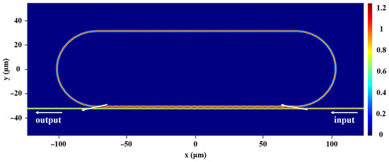 Figure 8 shows the electric field intensity distribution of light in a racetrack microring resonator. The incident light enters from the input end of the diamond/LNOI waveguide. When the light propagates in the waveguide and generates total reflection, there are evanescent waves, but when the gap between the straight waveguide and the racetrack is small enough, the evanescent waves could be coupled into the racetrack. When the light in the racetrack and the light in the straight waveguide meet the conditions of interference reinforcement, the coupling efficiency could be greatly improved. When the light in the racetrack passes through the output end around the microring, the wavelength that satisfies interference reinforcement is coupled into the straight waveguide and output from the output end, and the wavelength that does not satisfy the interference reinforcement condition cannot enter the straight waveguide.