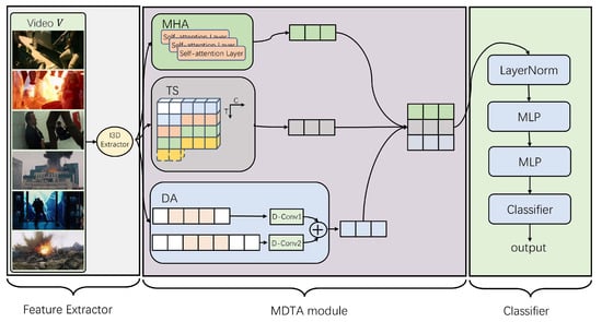 The proposed temporal relation aggregation network aims to train with weakly labeled videos to distinguish between anomaly and normal segments. The core module of the network is the MTDA module with three branches, where the first branch is the multi-head attention branch MHA that maps video features and audio features to different semantic spaces. The second branch is the temporal pyramid branch DA, which extracts multi-scale information on the temporal dimension via different dilated convolution blocks. The third branch is the temporal shift module TS, which perturbs the temporal sequence by partially flowing the information of different frames on the temporal dimension to achieve the effect of temporal modeling. The overall structure is shown in Figure 1.