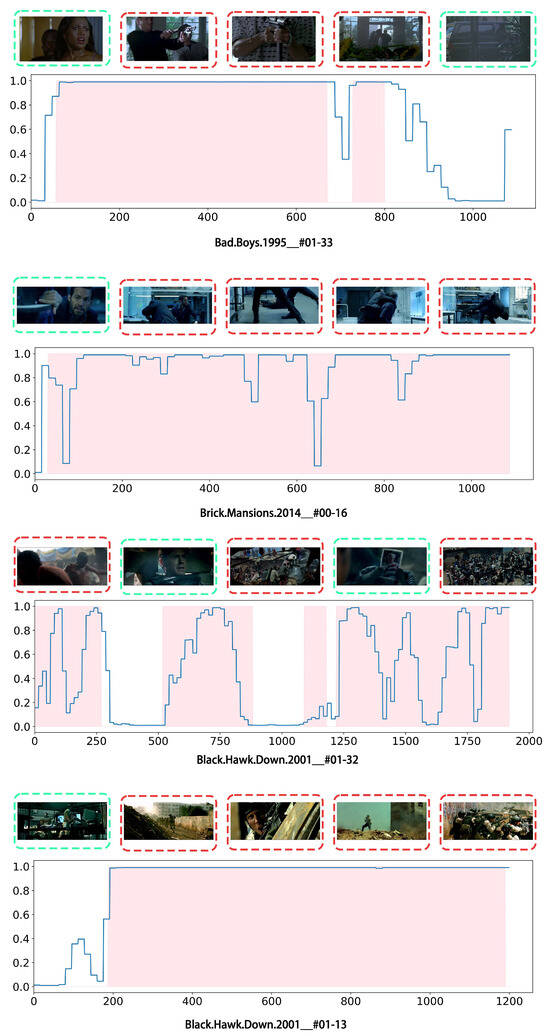 To further demonstrate the effectiveness of MTDA-Net, we visualize the anomaly scoring results on the validation set of XD-Violence. As shown in Figure 4, on the validation set of XD-Violence, we randomly sampled four videos (Bad.Boys.1995 #01-33, Black.Hawk.Down2001 #01-13, Brick.Mansions2014 #00-16, and BlackHawkDown2001 #01-32). MTDA-Net can represent normal events with smaller scores and anomaly events with larger scores. In addition, as shown in the videos (Black.Hawk.Down2001 #01-32, Black.Hawk.Down2001 #01-13), MTDA-Net can predict the anomaly scores of multi-segment anomalous events and of long-term anomalous events in the XD-Violence dataset with relative accuracy. Furthermore, as can be seen from the figure, the rise in anomaly scores tends to have a certain upward curve, and, even among the labeled anomalous regions, there is a significant portion of regions where the anomaly scores are not very high, which we found out by watching the original video, determining that even among the anomalous regions labeled in the dataset, a portion of the normal picture exists.