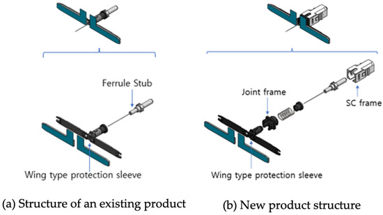 To protect the splice point without the use of heat shrink tubing, a protective sleeve with double-sided adhesive tape is attached to the ferrule [16] module. In addition, a joint frame and an SC frame (shell) [17] are combined with a ferrule module with a wing sleeve to form a complete optical connector head. The joint frame is designed to be combined with the cable boot. Figure 5 shows the configuration diagram of the fusion-spliced wing-type ferrule optical connector head between an existing product (a) and our new design (b).