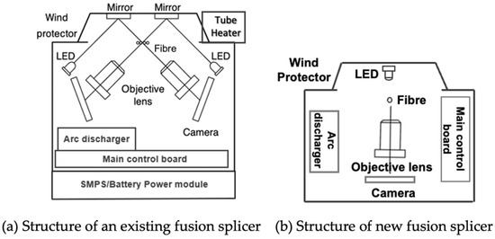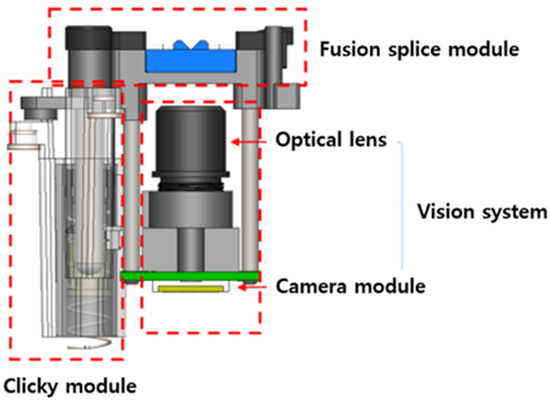 As shown in Figure 8, the developed fusion splicer consists of an arc discharge module that generates heat by high voltage electrode discharge [19], a horizontal axis movement module for transporting the optical connector head and fibre optic cable, and a vision system used to align the optical fibres in conjunction with the horizontal axis movement.