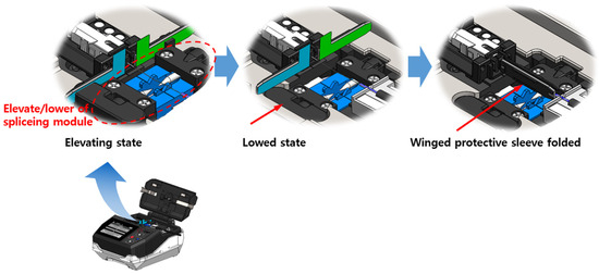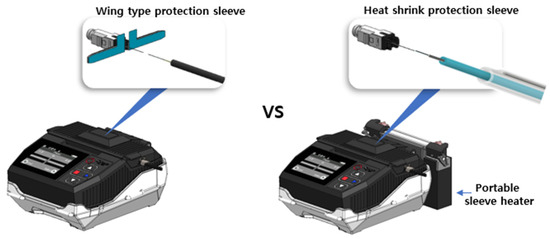 To solve this problem, this paper proposes a fusion-spliced optical connector without shrink tubing [5] and a fusion splicer with reduced size and cost by eliminating a heating tube module. In this paper, a fusion splicing field-assembled optical connector, which protects the splice point with wing sleeves on the optical connector head instead of a tube heater, and a fusion splicer with an elevating/lowering function, are developed for the fusion splicing field-assembled optical connector. The developed fusion splicer eliminates the tube heater used in the existing fusion splicer [6,7] and minimizes the power module, which allows it to be hung around one’s neck without a stand, making it possible to work with both hands. In order to analyse the performance and characteristics of the developed optical connector and fusion splicer, the splicing performance and assembly times were measured.