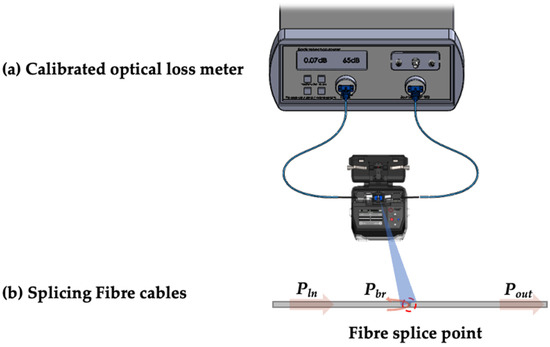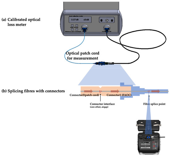 As a first experiment to investigate the splicing performance of the fusion splicer, the splice point’s insertion loss and return loss were evaluated by connecting the optical fibre and the optical fibre. A calibrated optical loss meter [21] was used for this experiment. As shown in the Figure 13, the light source to be measured was initialised using the optical patch cord for the measurement. Then, after cutting the optical patch cord, it was fusion-spliced using the fusion splicer developed in this paper. The measured values are recorded by the meter.