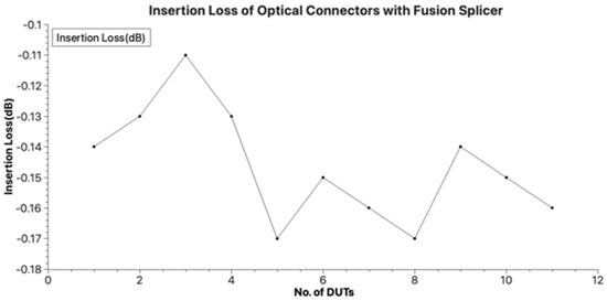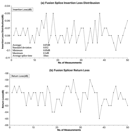 Figure 14 shows the splice loss distribution of the fusion splicer developed in this paper as measured in the first experiment. The insertion loss caused by fusion splicing is mostly distributed around −0.07 dB and it can be seen that the return loss is within −60 dB. With a standard deviation of 0.012, it can be confirmed that the splice loss is stable for all samples. The Korea Telecommunication Corporation Association, which consists of Korean Internet Service Providers (ISPs), has established and applied Internet FTTH facility standards [22] with the aim of maintaining communication standards and quality between operators. The facility standards include FTTH and home networks, which cover fibre-to-the-premises networks. The insertion loss required for the fusion splice point in the facility standard is within −0.1 dB, and the experimental results meet the standards required by the association.