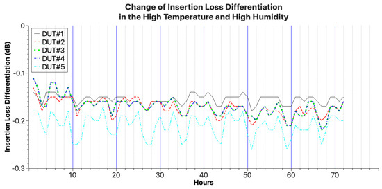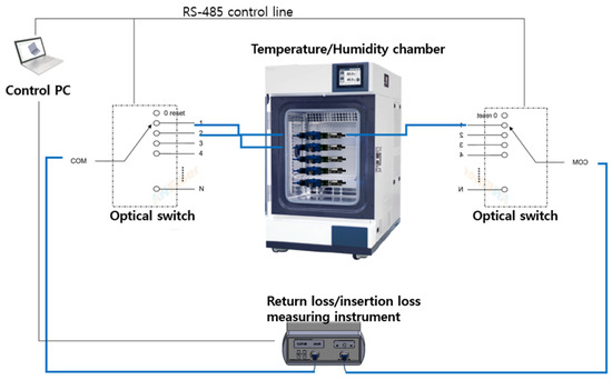 Next, the performance of the protective sleeve inside the optical connector was checked by measuring the loss change based on the temperature change in the optical connector. The experiment followed the procedure of the GR-326-CORE [23] temperature cycle tester and the temperature change was measured for nine cycles, each cycle lasting eight hours, as shown in Figure 16. The test setup is shown in Figure 17.