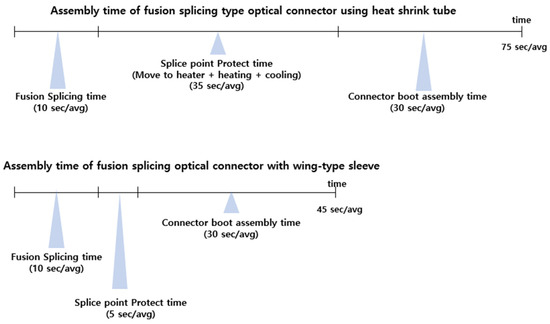 The results of the third experiment are shown in Figure 21. This is the result of a comparative experiment between the fusion-spliced optical connector equipped with the wing sleeve developed in this paper and the fusion-spliced optical connector using the existing protective tube. The results showed that the insertion losses were similar for both samples, but when measuring the fusion splice, the time to protect the splice point and the time to assemble the optical connector boot, it was confirmed that there was a time difference of 20 s or more. Specifically, the total time required for the splicing and assembly of optical connectors was analysed by dividing it into work stages. Equipment operation time and operator operation time were classified separately. From the analysis results, it was confirmed that the chapter where the time difference occurs is the process of protecting the optical fibre joint, as shown in Figure 22, and it was also confirmed that the point where the fibre disconnection occurs, as shown in Figure 21a, also occurs at the joint protection point.