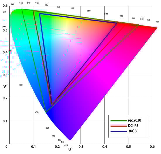 In the case of flat-panel monitor displays (LCD), color management system (CMS) technology has been developed based on the International Color Consortium (ICC) standards. According to ISO 15076-1 [9], this CMS can also be applied to VR headsets in a similar manner [4]. For videos and images displayed on these monitors, the BT. Rec.709 standard is used for high-definition television while the BT. Rec.2020 standard is utilized for ultra-high-definition television. Both of these standards have been defined by the International Telecommunication Union (ITU) and serve as color-reference standards. In the film industry, DCI-P3, designed as a digital-cinema standard, is widely employed in mobile devices as a next-generation display standard for technologies such as OLED and Micro LED [10,11,12]. Figure 2 shows a color comparison between the abovementioned three-color gamut.
