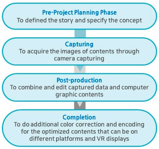 Generally, image quality is closely influenced by factors such as the illuminance or color temperature of the ambient light, viewing distance, and viewing angle. However, VR circumvents some of these concerns because they block out all light [17]. Rather, the main concern is ensuring accurate color representation. Pouli et al. presented a workflow for producing VR contents as described in Figure 3 [18]. In this production process, the visual data undergo multiple transformations and combinations, followed by a re-encoding process. At each step of the workflow, the color space, container, and encoding attributes are applied differently, and this determines how the color contained in each pixel is mapped. Thus, evaluating the quality of color reproduction becomes challenging without knowledge of the device information and the final VR display built-in panel [19].