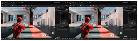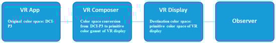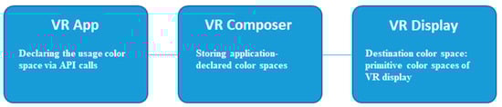 In the case of the Oculus Quest, a 3 × 3 color correction matrix is utilized to enable the mapping of RGB primary colors and white points as target values through a color space correction pipeline in the VR runtime. The flow of color information within the VR application is depicted in Figure 5, while the rendering process within the VR application can be observed in Figure 6 [27,28,29].
