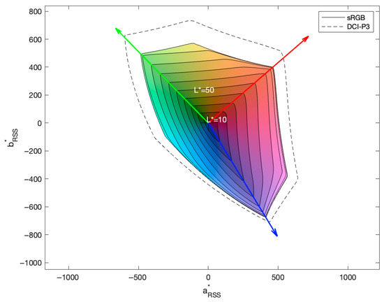 However, despite the existence of a standard value, there is still a deviation from this value due to the nature of the display. Obtaining XYZ values corresponding to all RGB values in order to fully characterize the display is impractical. Figure 7 shows the difference in lightness between the DCI-P3 and sRGB color gamut at L* = 50 and L* = 10. Characterizing colors becomes more complex when the lightness varies between color gamuts. In addition, Figure 8 shows the color shift in saturation when adjusting gamut range from sRGB to P3 to highlight the challenges in maintain color fidelity.