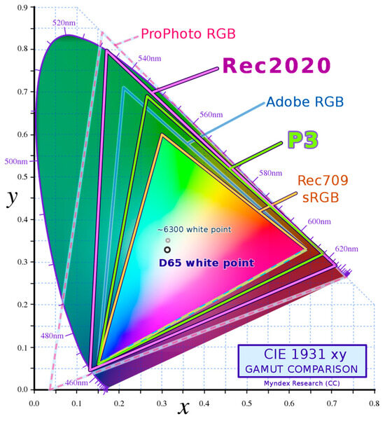 Comparison between the DCI-P3 color gamut and sRGB and Rec.2020.