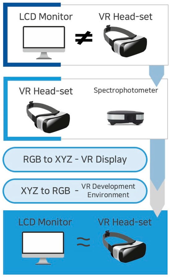 Recent research has been conducted with the focus on color-related aspects of HMDs [2,3]. In particular, an accurate color calibration of the VR HMD, both in terms of luminance and chromaticity, received attention because due to the large field of view of the HMD or the software implementation used for scene rendering, the color constancy present significant new challenges [4]. For example, Kim conducted experiments to measure color reproduction on VR displays with three contents using different color spaces. It also aimed to evaluate the quality of VR runtime color space calibration on VR HMDs [5]. Furthermore, recent technological advancements have enabled the analysis of VR users’ perceptions through techniques such as EEG or eye tracking in order to provide valuable insights for VR product design and development [6,7,8]. However, there has been little attention given to VR color representation research from the designers’ perspective during the content creation process. Thus, the primary objective of this study is to identify the optimal color space for a VR graphic designers’ PC monitor in a workplace, which is distinct from the previous research that addressed color reproduction on VR HMDs.