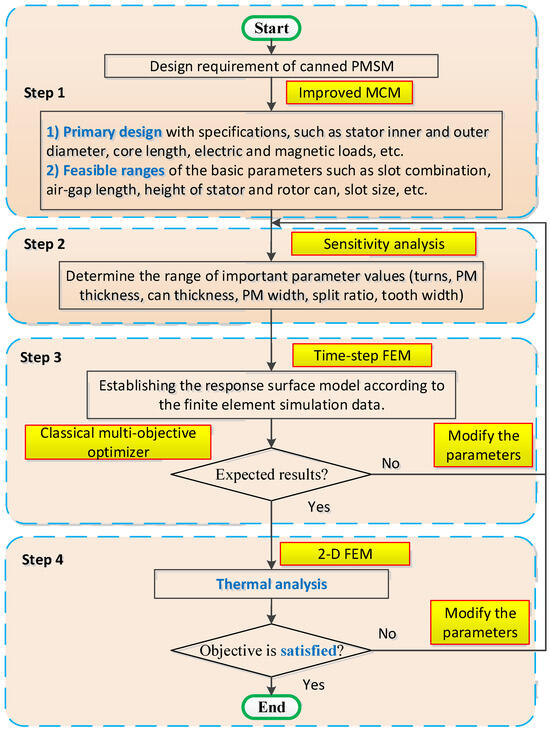 This paper proposes a synergistic optimization design method that combines the equivalent magnetic circuit method and the finite element method to optimize the overload capacity and efficiency of the CPMSM. A flowchart of the design process is shown in Figure 1.