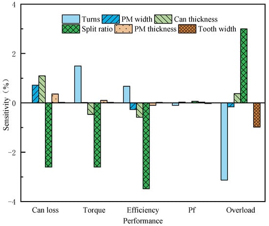 These performance indexes include can loss, output torque, efficiency, power factor, and overload capacity. Figure 2 shows the sensitivity value of each design parameter to the objective.