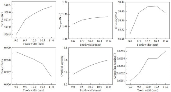 To determine the impact of tooth width and can sleeve thickness on individual objectives, an analysis was performed on their effects on motor performance. The results are shown in Figure 3 and Figure 4.