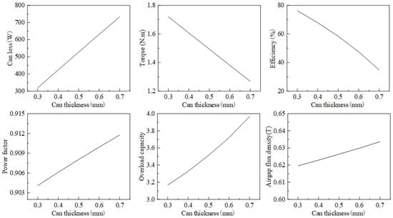 Equation (6) reveals that there are numerous factors influencing the can loss and electromagnetic torque of a CPMSM, including the motor speed, number of turns, pole arc coefficient, winding coefficient, stator core length, inner diameter of the can sleeve, can sleeve thickness, and can sleeve conductivity. Therefore, the parameter selection for designing a high overload capacity and low can-loss CPMSM poses certain difficulties.
