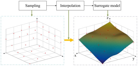 The response surface surrogate model is the most commonly used interpolation fitting model. This method performs spatial modeling and prediction based on the covariance function random process or random field. It builds a more accurate surrogate model to replace actual computationally intensive experiments or simulations. It greatly saves time and costs for engineering and academic research []. Figure 5 provides a visual description of the process of establishing the surrogate model.