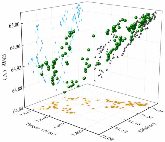 Based on the established response surface model and optimization function, this study chooses the NSGA-II as the iterative optimization algorithm for the entire motor design process. The NSGA-II has been improved in the use of fast non-dominated sorting, genetic operations, and crowding distance to enhance the diversity and quality of the solution set. These improvements make NSGA-II an excellent multi-objective optimization algorithm with better effectiveness and performance compared to the NSGA []. Based on the NSGA-II, an optimization design of electrical machine parameters was performed, resulting in a Pareto frontier solution set as shown in Figure 6.
