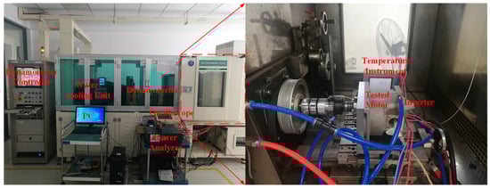 In Figure 9, the experimental platform consists of the prototype, inverter, torque-speed tester, dynamometer and its controller, cooling equipment and its controller, adjustable temperature chamber, and various measurement devices such as power analyzer, oscilloscope, temperature monitor, and thermal imaging camera. The prototype inverter utilized is the Kewo AD800N. The power analyzer employed is Fluke NORMA5000, produced in Everett, USA, and the oscilloscope selected is Yokogawa DL750, produced in Yokohama, Japan.